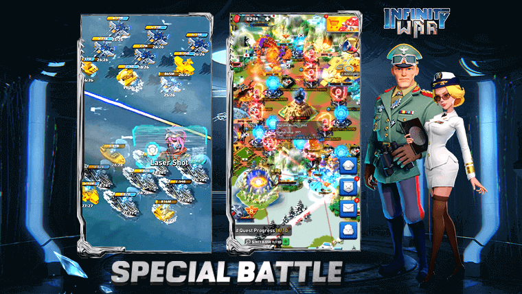 Infinity War is an innovative strategy game featuring merge to upgrade gameplay, no more long upgrade waiting times, just merge two together and the upgrade will finish instantly! Recruit Legendary Heroes to lead the stationed Land, Navy and Air Force troops to victory!